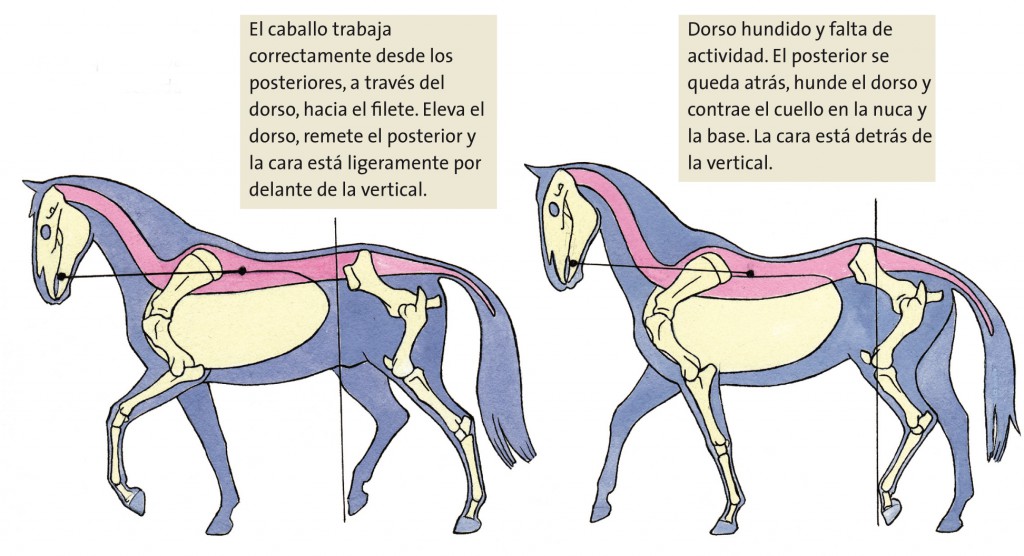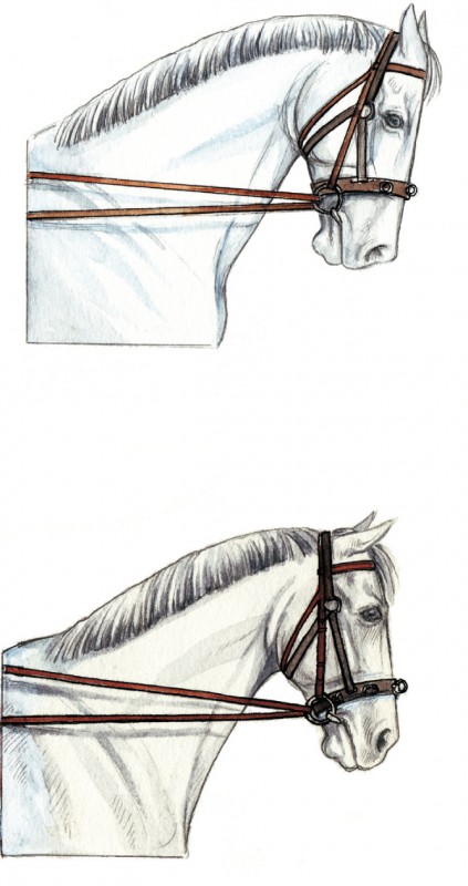 Hay que enseñarle a mantener contacto con las riendas laterales; el domador debe hacerlo avanzar cuando se queda detrás del contacto, y alternar medias paradas con empujarlo hacia delante si pone resistencia y levanta la cabeza. El trabajo correcto –con energía desde los posteriores, pasando a través del dorso hacia el filete –fortalece los músculos adecuados en los lugares adecuados.