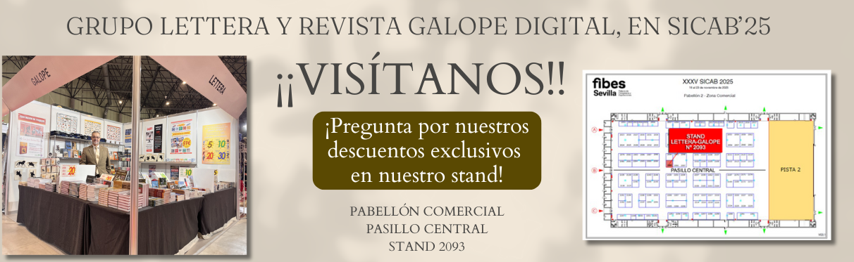 Un año más, Grupo Lettera junto a la Revista Galope Digital forman el tándem perfecto en SICAB con el stand LETTERA-GALOPE situado en el Pabellón 2 (conocido como PABELLÓN COMERCIAL). En el stand número 2093, situado en el PASILLO CENTRAL, podrán visitarnos todos los profesionales y aficionados del mundo del caballo que quieran aprovecharse de las ofertas que allí tendremos en libros, pendrives y muchos productos más